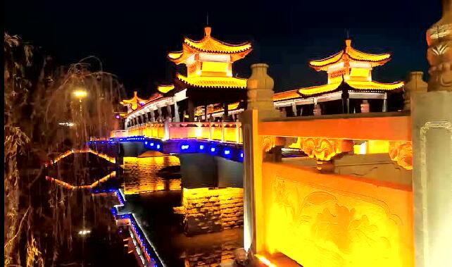 太平橋用隱藏式的瓦楞投光燈照亮建筑屋面,變幻四季顏色,絢麗多彩,形成一定的韻律感,河中倒影給人波光粼粼的勝境,整體氣勢(shì)恢弘,在橋的欄桿下一側(cè)用定制的祥云圖案燈順序排列,寓意祥和、太平,突出太平盛世文化。